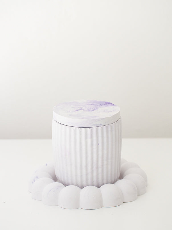 Ο δίσκος είναι χειροποίητος από πορσελάνη με ανάγλυφη επιφάνεια και μικρές σφαιρικές λεπτομέρειες (bubbles), διαθέσιμος σε παστέλ αποχρώσεις. Το βάζο είναι επίσης χειροποίητο από πορσελάνη και περιέχει κερί, με δυνατότητα επιλογής αρώματος. Τα κουφέτα δένονται εξωτερικά στο βάζο, ενώ υπάρχει δυνατότητα προσθήκης καρτελακίου με όνομα ή ημερομηνία.