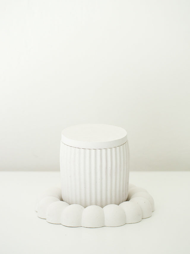 Ο δίσκος είναι χειροποίητος από πορσελάνη με ανάγλυφη επιφάνεια και μικρές σφαιρικές λεπτομέρειες (bubbles), διαθέσιμος σε παστέλ αποχρώσεις. Το βάζο είναι επίσης χειροποίητο από πορσελάνη και περιέχει κερί, με δυνατότητα επιλογής αρώματος. Τα κουφέτα δένονται εξωτερικά στο βάζο, ενώ υπάρχει δυνατότητα προσθήκης καρτελακίου με όνομα ή ημερομηνία.