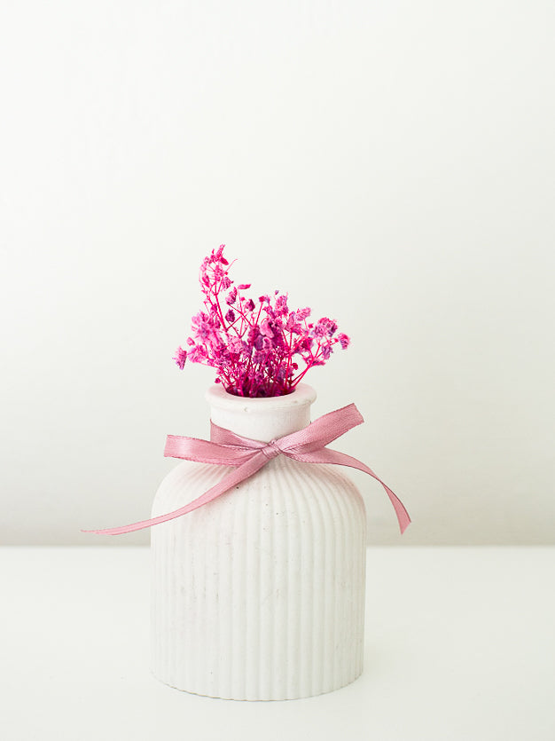 Χειροποίητο βαζάκι από προσελάνη σε κλασικό λευκό χρώμα, διακοσμημένο με σατέν κορδέλα και αποξηραμένα λουλούδια σε φυσικούς και παστέλ τόνους. Κομψή και ουδέτερη επιλογή που προσαρμόζεται εύκολα σε κάθε στυλ εκδήλωσης.
